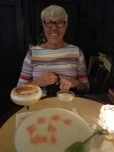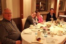 By the time we returned to the ship, Mom and I rushed to the bar for wine and then took it to our cabin where we started packing up our things. I took a hot shower to help relax my neck that was still very sore and after we were mostly packed and changed in to warmer clothes we headed back to the lounge to meet up with our friends and a toast from the captain for having us aboard. While we were drinking in the lounge we met Donna and Dennis from Toronto whom I liked immediately and when we finally went down to dinner we got one of the larger tables and Beth, Mike, Judy, Dennis,Donna and Dennis all sat with us. It was a great dinner – both food and company wise. I had scallops and a number of other things and we were all served the chocolate souffle from the night before.