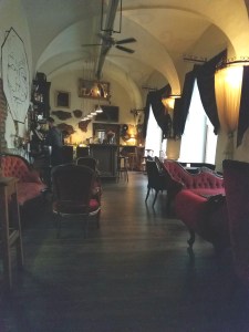 After finishing our drinks we headed back in to the rain and made our way as quickly as possible down the hill. Across the bridge and back to the bar that Kate had tried taking us to the night before. Called ‘the anonymous bar’ it is themed after the movie “V for Vendetta” and is very cool inside with large red velvet furniture, heavy drapery and smoky mirrors. The bar is known for its cocktails and the menu was extensive. Unable to make up our minds we asked the waiter for suggestions, he asked if it would be okay to surprise us, so we told him what we liked and he brought out two very unique cocktails, mine a vodka base with some serious citrus kick that had been blended slushy style and Mom’s which had a base of scotch and some kind of marmalade in it. Both drinks were delicious but together cost more than lunch for 4 had earlier; we only had one and left.